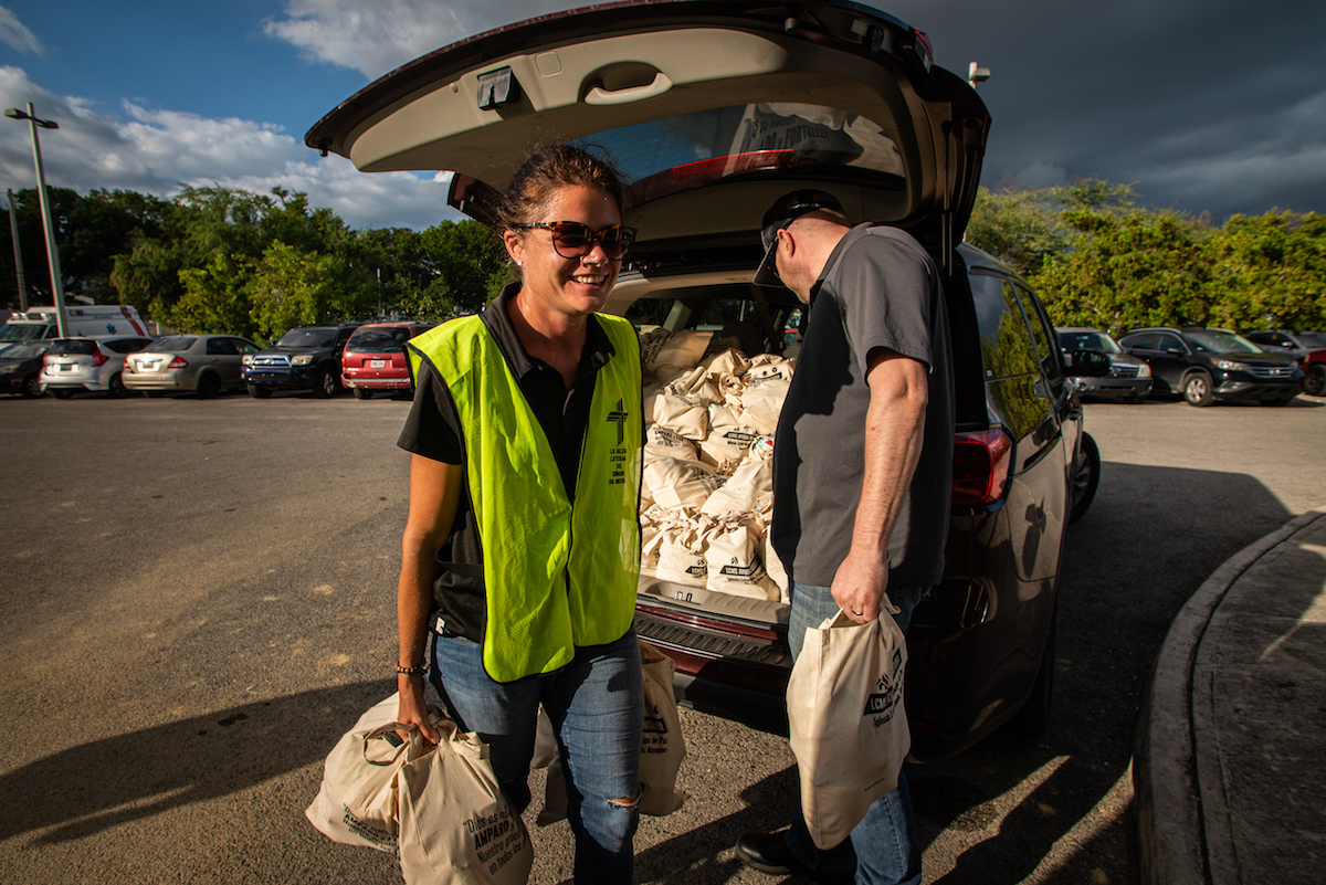 Deaconess Christel Neuendorf and Business Manager Blake Warren distribute relief supplies