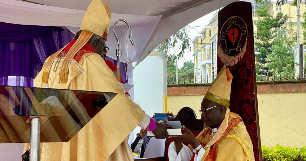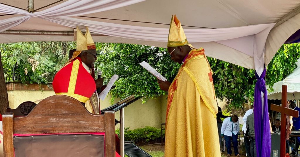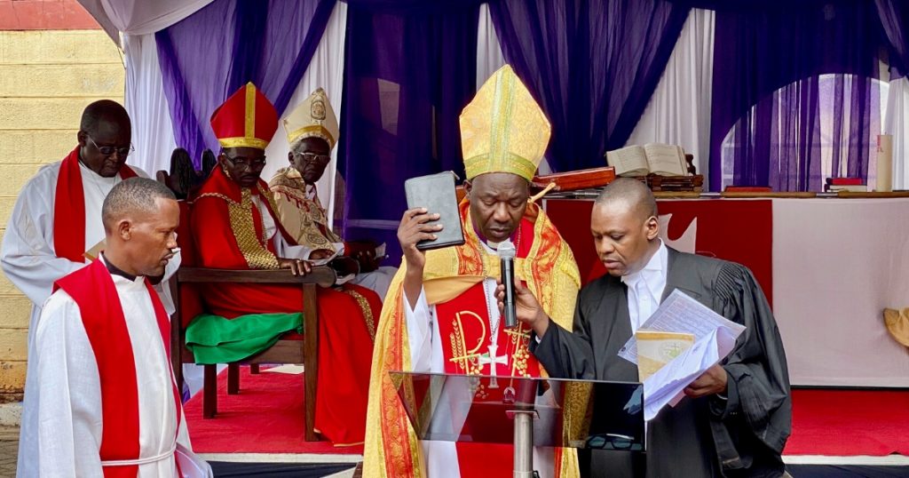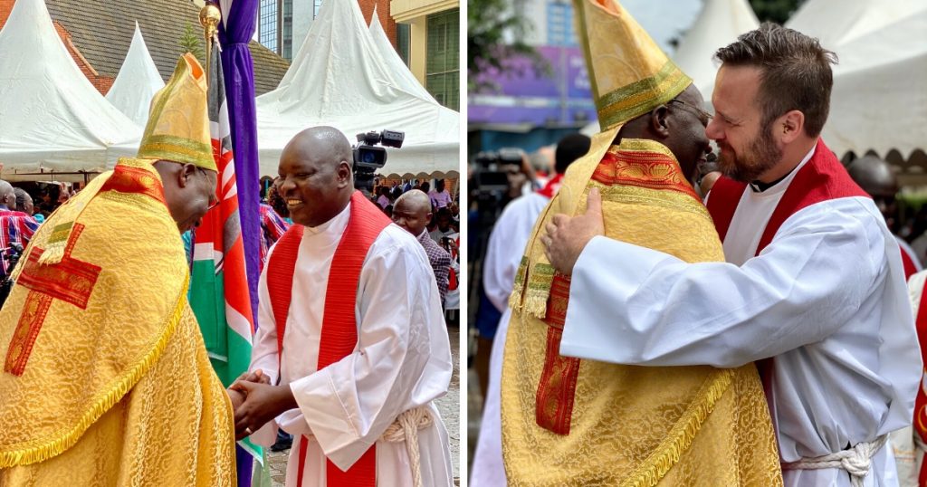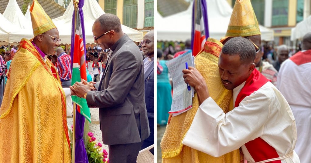 Bishop Emeritus Walter Obare was the presiding minister, and presented Archbishop Ochola with the Book of Concord and the Confessions of the Evangelical Lutheran Church. Afterwards, Archbishop Ochola is congratulated by his brothers in Christ.