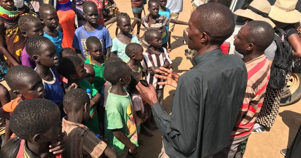 Speaking to the children in the refugee camp