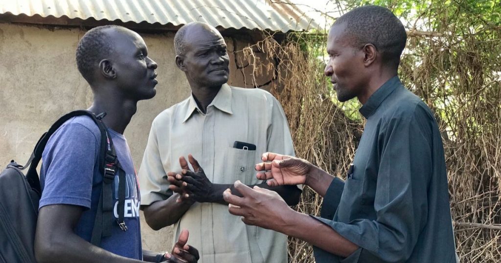 Rev. Mutai talking with Rev. John Riay and local evangelist Bravo in the Kakuma refugee camp